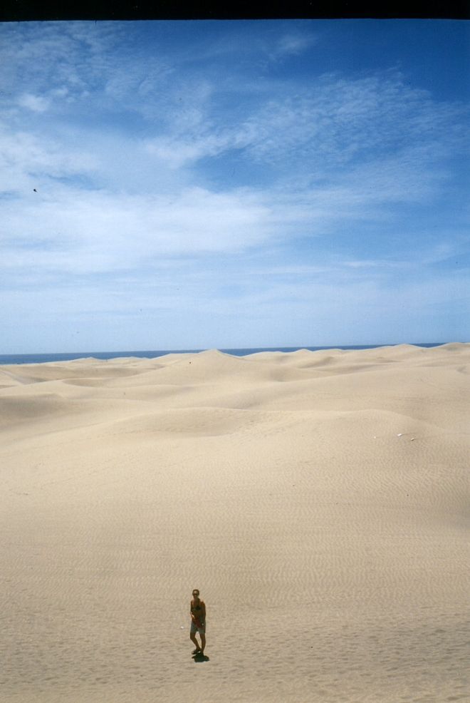 Lasciato nuovamente il campeggio - è il 16 luglio - ci dirigiamo verso nord incontrando Las Salinas; qui, in centinaia di vasche fatte di sassi, viene fatta evaporare l'acqua del mare per ottenere il sale. A pochi chilometri si trova un'attrezzata località molto accogliente e organizzata, Caletta de Fustes; segue Puerto del Rosario e, dopo una trentina di chilometri, improvvisamente ecco le dune di Corralejo: sembra di essere su un'altra isola e di attraversare il deserto del Sahara su una comoda strada asfaltata.
