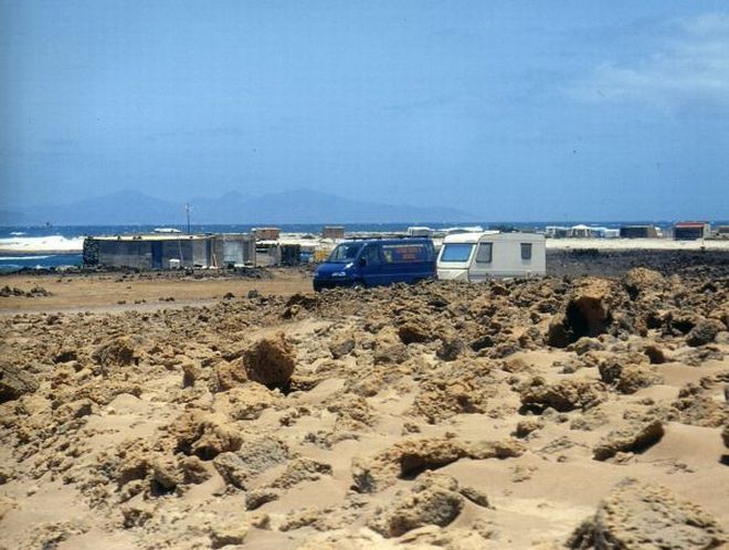 Superata Corralejo - con un mercato settimanale frequentato da moltissimi inglesi e tedeschi - imbocchiamo una strada sterrata in direzione El Cotillo, ma poco prima di raggiungere il faro De Toston affondiamo in una buca di sabbia. Dopo vari tentativi e l'aiuto di un fuoristrada recuperiamo il furgone, ma non ha il gancio traino e la caravan rimane lì! Fortunatamente nei paraggi c'è un ragazzo con un pick-up, che poco dopo mette in salvo anche la nostra Adria.