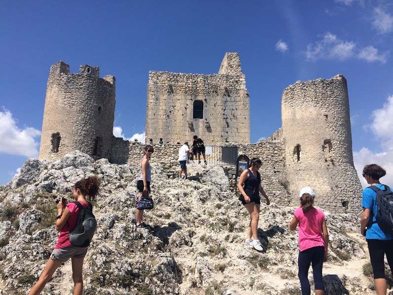 Ci beviamo un caffè in piazza e partiamo alla volta di Rocca Calascio, un eremo arroccato sulla sommità di uno sperone roccioso. Alla rocca si arriva tramite una navetta che parte dalla piazza del paese, così ci risparmiamo 3Km di strada a piedi e in salita.